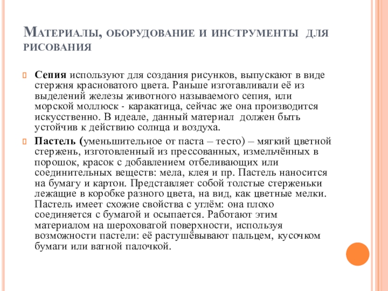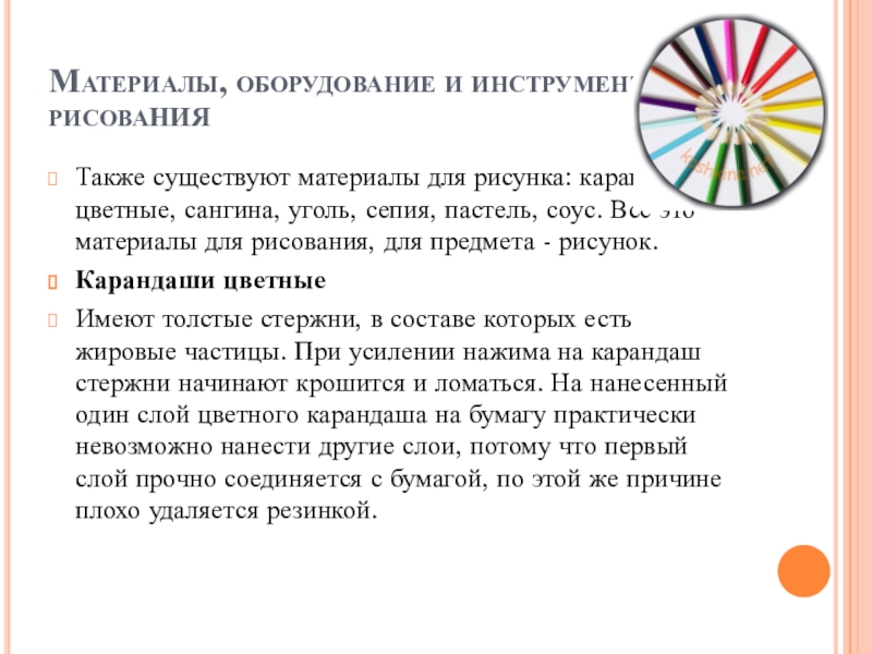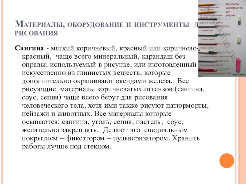 цветные, сангина, уголь, сепия, пастель, соус. Всё это материалы для рисования, для предмета - рисунок.