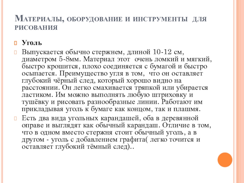 диаметром 5-8мм. Материал этот очень ломкий и мягкий, быстро крошится, плохо соединяется с бумагой и быстро осыпается. Преимущество угля в том, что он оставляет глубокий чёрный след, который хорошо видно на расстоянии. Он легко смахивается тряпкой или убирается ластиком. Им можно выполнять любую штриховку и тушёвку и рисовать разнообразные линии. Работают им прикладывая уголь к бумаге как концом, так и плашмя.