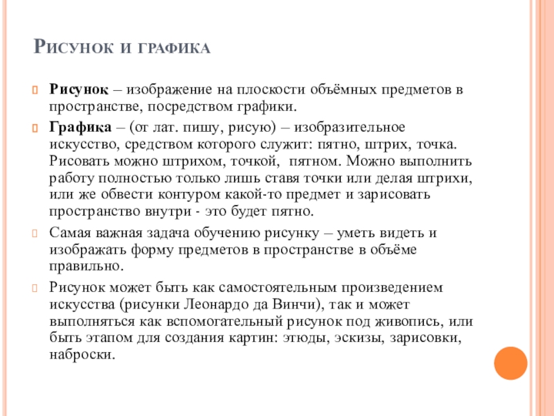 Графика – (от лат. пишу, рисую) – изобразительное искусство, средством которого служит: пятно, штрих, точка. Рисовать можно штрихом, точкой, пятном. Можно выполнить работу полностью только лишь ставя точки или делая штрихи, или же обвести контуром какой-то предмет и зарисовать пространство внутри - это будет пятно.