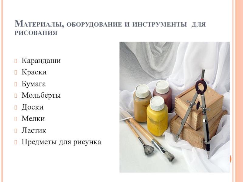 Слайд 3Материалы, оборудование и инструменты для рисования