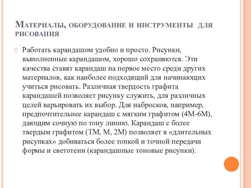 выполненные карандашом, хорошо сохраняются. Эти качества ставят карандаш на первое место среди других материалов, как наиболее подходящий для начинающих учиться рисовать. Различная твердость графита карандашей позволяет рисунку служить, для различных целей варьировать их выбор. Для набросков, например, предпочтительнее карандаш с мягким графитом (4М-6М), дающим сочную по тону линию. Карандаш с более твердым графитом (ТМ, М, 2М) позволяет в «длительных рисунках» добиваться более тонкой и точной передачи формы и светотени (карандашные тоновые рисунки).
