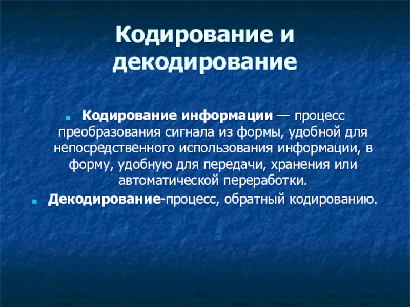 Кодирование и декодированиеКодирование информации — процесс преобразования сигнала из формы, удобной для непосредственного использования информации, в форму, удобную