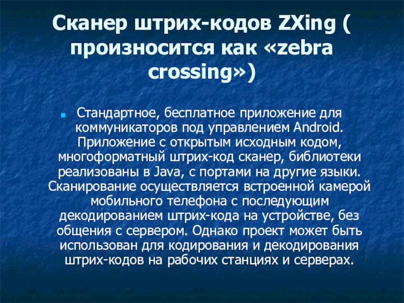 Слайд 7Сканер штрих-кодов ZXing ( произносится как «zebra crossing»)