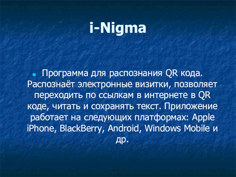 i-NigmaПрограмма для распознания QR кода. Распознаёт электронные визитки, позволяет переходить по ссылкам в интернете в QR коде,