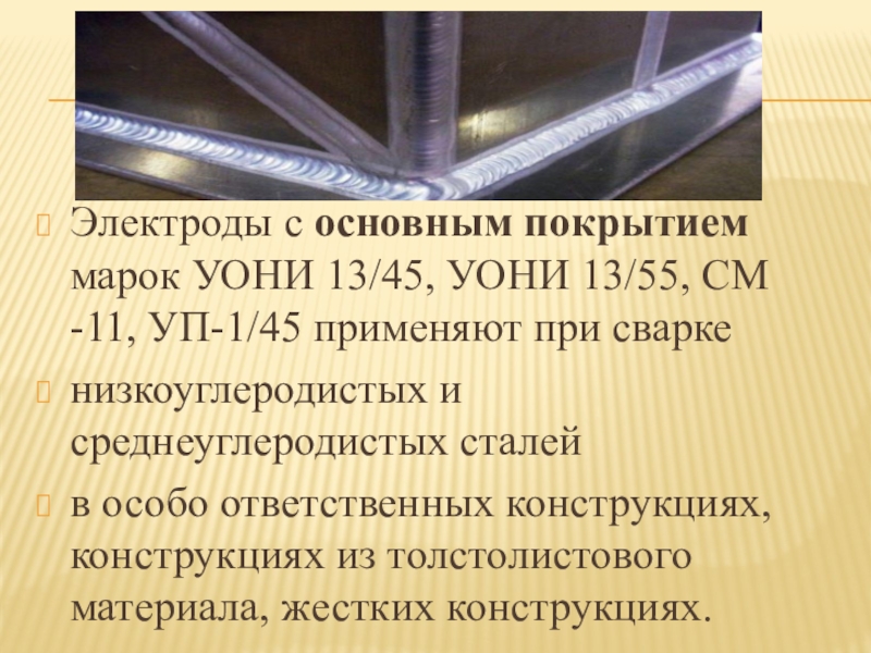 Слайд 7Электроды с основным покрытием марок УОНИ 13/45, УОНИ 13/55, СМ -11,