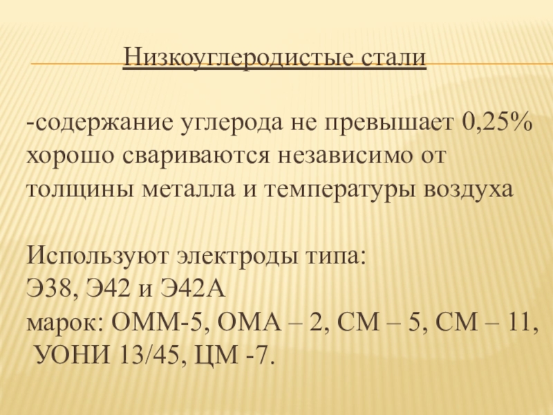 Низкоуглеродистые стали -содержание углерода не превышает 0,25% хорошо свариваются независимо от толщины металла и температуры воздуха Используют электроды типа: Э38, Э42 и Э42А марок: ОММ-5, ОМА – 2, СМ – 5, СМ – 11, УОНИ 13/45, ЦМ -7.