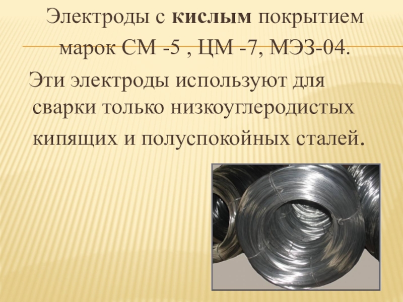 Электроды с кислым покрытием марок СМ -5 , ЦМ -7, МЭЗ-04. Эти электроды используют для сварки только