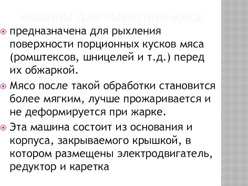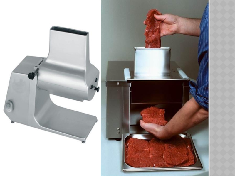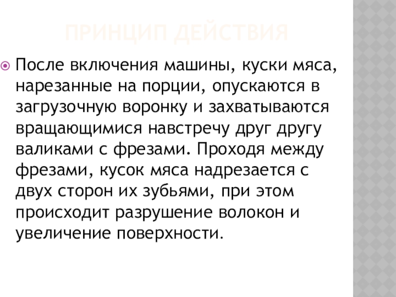 загрузочную воронку и захватываются вращающимися навстречу друг другу валиками с фрезами. Проходя между фрезами, кусок мяса надрезается с двух сторон их зубьями, при этом происходит разрушение волокон и увеличение поверхности.
