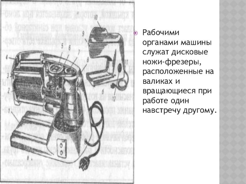 Слайд 12Рабочими органами машины служат дисковые ножи-фрезеры, расположенные на валиках и вращающиеся