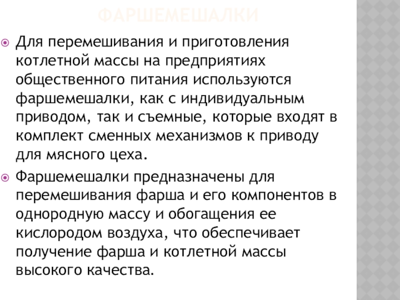 Фаршемешалки предназначены для перемешивания фарша и его компонентов в однородную массу и обогащения ее кислородом воздуха, что обеспечивает получение фарша и котлетной массы высокого качества.