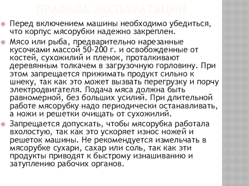 Запрещается допускать, чтобы мясорубка работала вхолостую, так как это ускоряет износ ножей и решеток машины. Не рекомендуется измельчать в мясорубке сухари, сахар или соль, так как эти продукты приводят к быстрому изнашиванию и затуплению рабочих органов.