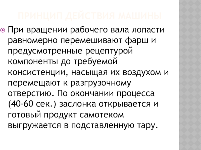 предусмотренные рецептурой компоненты до требуемой консистенции, насыщая их воздухом и перемещают к разгрузочному отверстию. По окончании процесса (40-60 сек.) заслонка открывается и готовый продукт самотеком выгружается в подставленную тару.