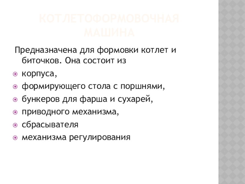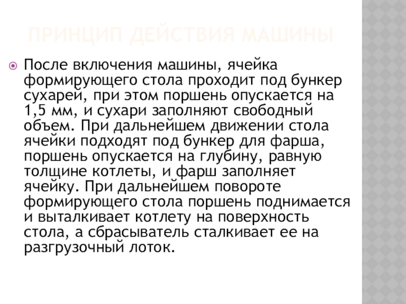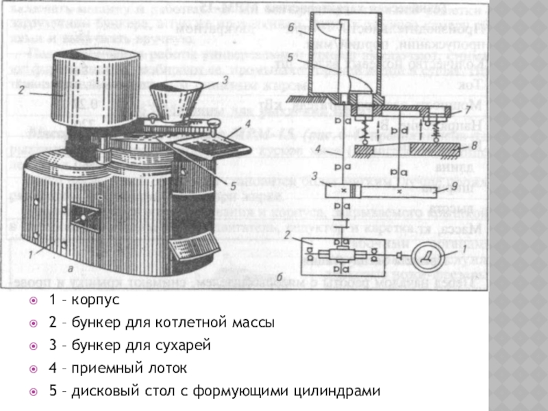 сухарей, при этом поршень опускается на 1,5 мм, и сухари заполняют свободный объем. При дальнейшем движении стола ячейки подходят под бункер для фарша, поршень опускается на глубину, равную толщине котлеты, и фарш заполняет ячейку. При дальнейшем повороте формирующего стола поршень поднимается и выталкивает котлету на поверхность стола, а сбрасыватель сталкивает ее на разгрузочный лоток.