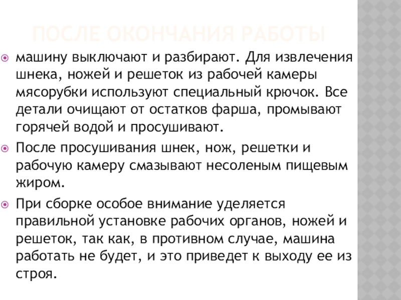 решеток из рабочей камеры мясорубки используют специальный крючок. Все детали очищают от остатков фарша, промывают горячей водой и просушивают.
