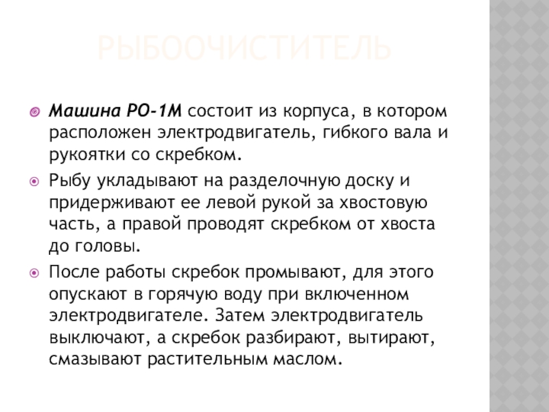 Рыбу укладывают на разделочную доску и придерживают ее левой рукой за хвостовую часть, а правой проводят скребком от хвоста до головы.