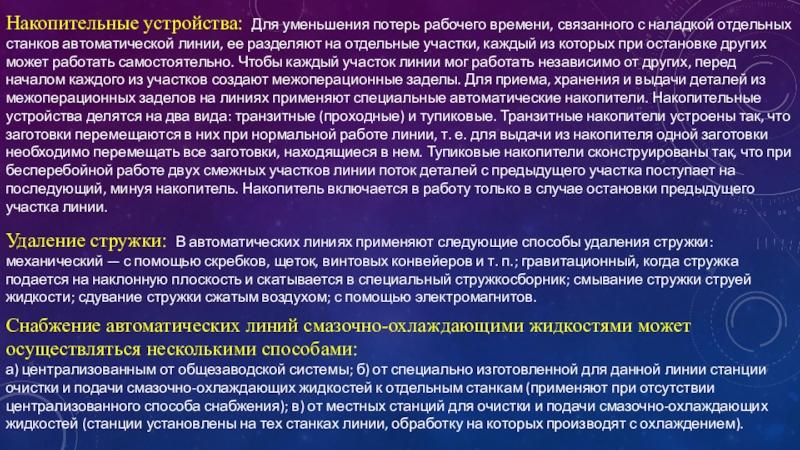 станков автоматической линии, ее разделяют на отдельные участки, каждый из которых при остановке других может работать самостоятельно. Чтобы каждый участок линии мог работать независимо от других, перед началом каждого из участков создают межоперационные заделы. Для приема, хранения и выдачи деталей из межоперационных заделов на линиях применяют специальные автоматические накопители. Накопительные устройства делятся на два вида: транзитные (проходные) и тупиковые. Транзитные накопители устроены так, что заготовки перемещаются в них при нормальной работе линии, т. е. для выдачи из накопителя одной заготовки необходимо перемещать все заготовки, находящиеся в нем. Тупиковые накопители сконструированы так, что при бесперебойной работе двух смежных участков линии поток деталей с предыдущего участка поступает на последующий, минуя накопитель. Накопитель включается в работу только в случае остановки предыдущего участка линии.