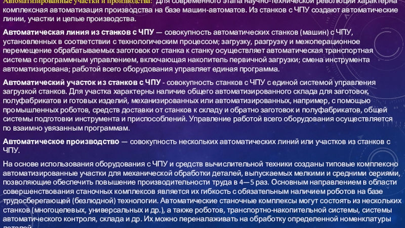 автоматизация производства на базе машин-автоматов. Из станков с ЧПУ создают автоматические линии, участки и целые производства.