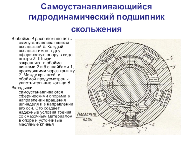 Слайд 8Самоустанавливающийся гидродинамический подшипник скольжения