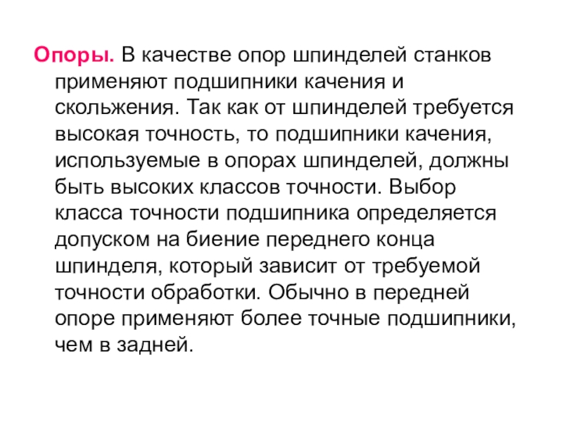 Слайд 6Опоры. В качестве опор шпинделей станков применяют подшипники качения и скольжения.