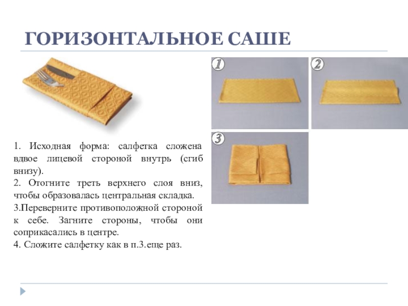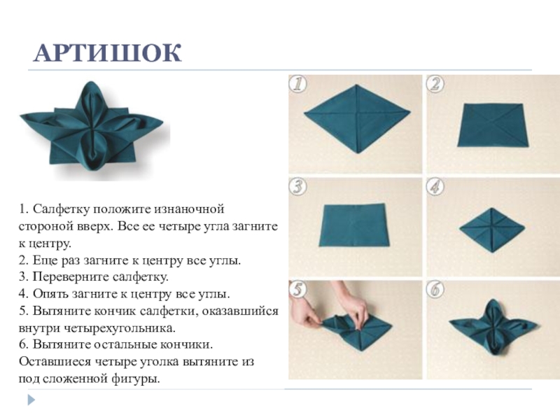 1. Исходно салфетка в расправленном виде лежит лицевой стороной