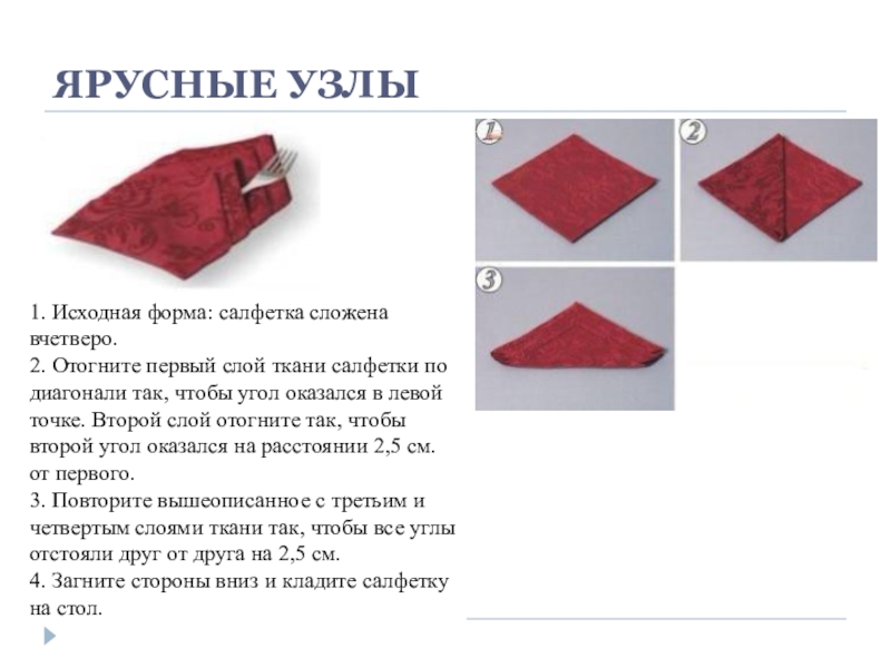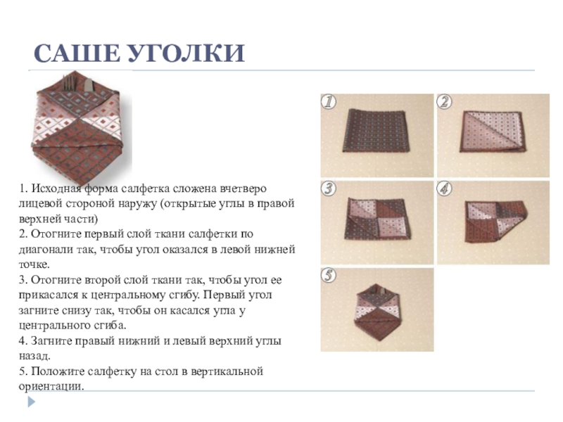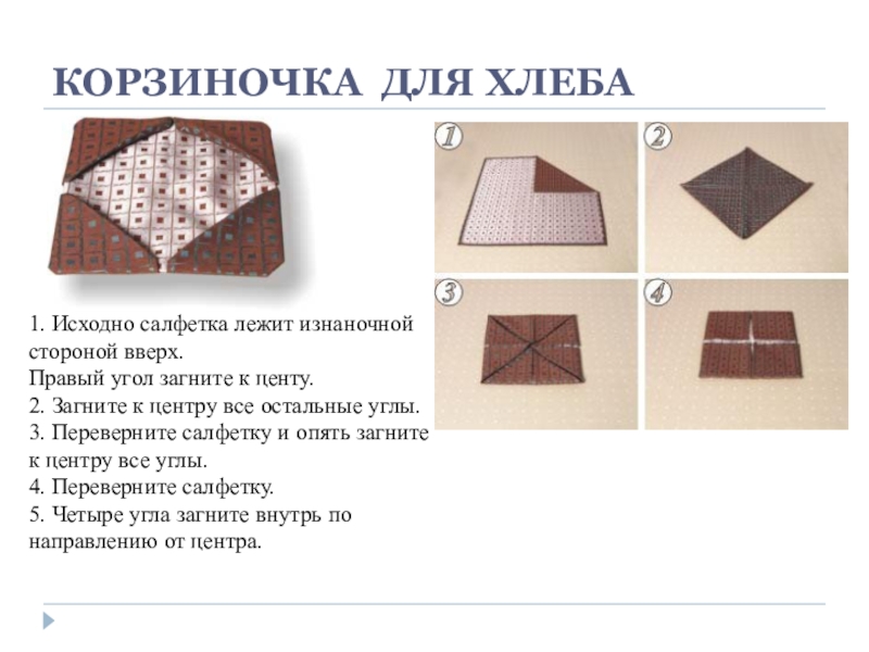 1. Исходная форма салфетка сложена вчетверо лицевой стороной наружу (открытые