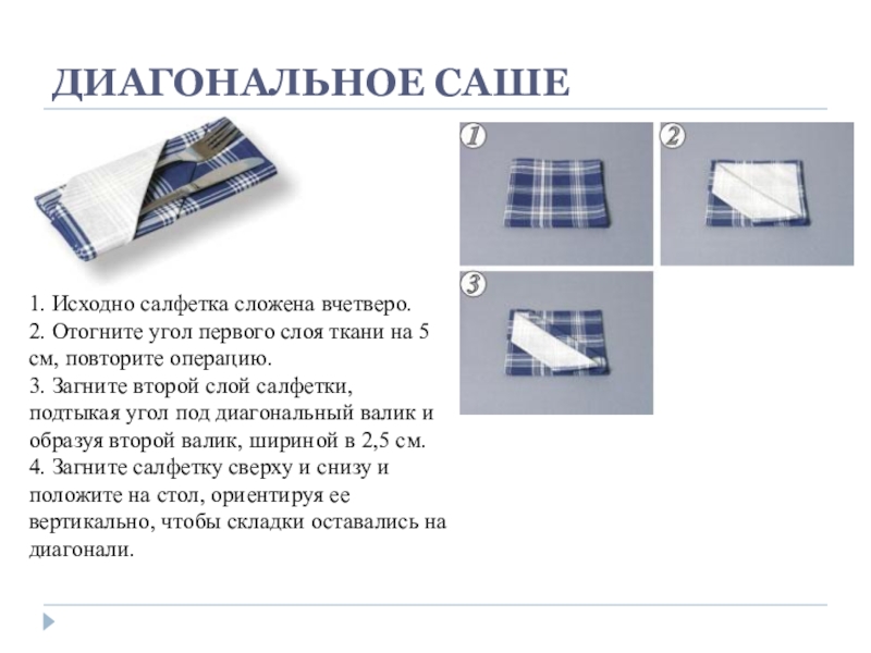 салфетки по диагонали так, чтобы угол оказался в левой точке. Второй слой отогните так, чтобы второй угол оказался на расстоянии 2,5 см. от первого.