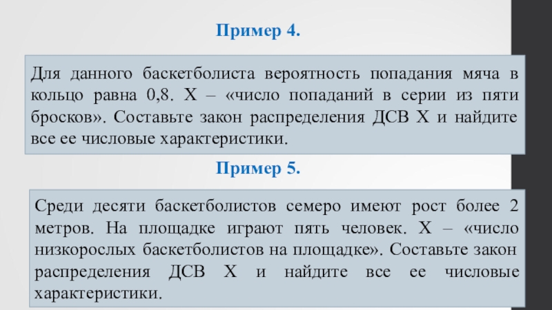 Среди десяти баскетболистов семеро имеют рост более 2 метров. На площадке играют пять человек. Х – «число низкорослых баскетболистов на площадке». Составьте закон распределения ДСВ Х и найдите все ее числовые характеристики.