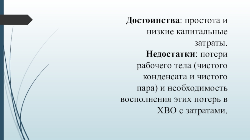 Достоинства: простота и низкие капитальные затраты.Недостатки: потери рабочего тела (чистого конденсата и чистого пара) и необходимость восполнения