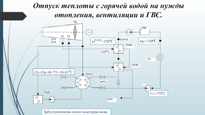 Отпуск теплоты с горячей водой на нужды отопления, вентиляции и ГВС.t2s=t2в+δt=75+10=85OCtsПСВ2=150ºСtПС=70ºСtпс=150ºСТрёхступенчатая схема подогрева воды