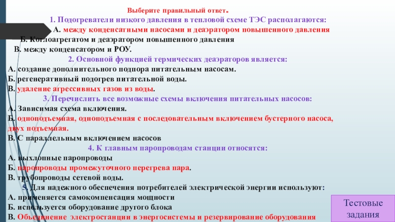 Тестовые задания Выберите правильный ответ.     1. Подогреватели низкого давления в тепловой схеме ТЭС