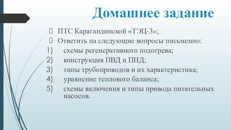 Домашнее задание ПТС Карагандинской «ТЭЦ-3»; Ответить на следующие вопросы письменно:схемы регенеративного подогрева;конструкция ПВД и ПНД;типы трубопроводов и