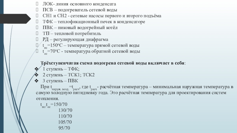 ЛОК- линия основного конденсатаПСВ – подогреватель сетевой водыСН1 и СН2 - сетевые насосы первого и второго подъёмаТФК