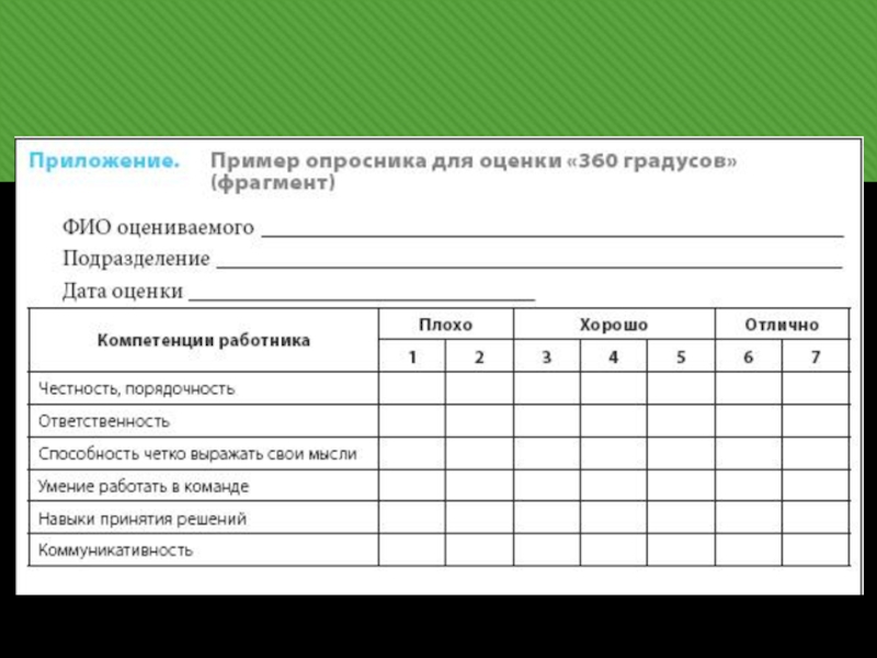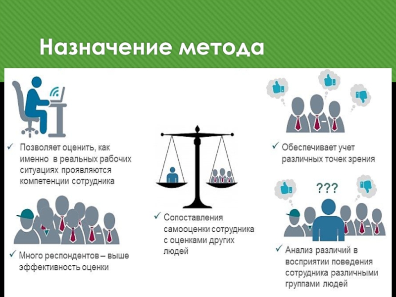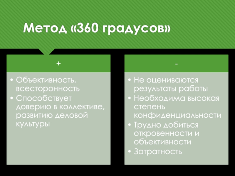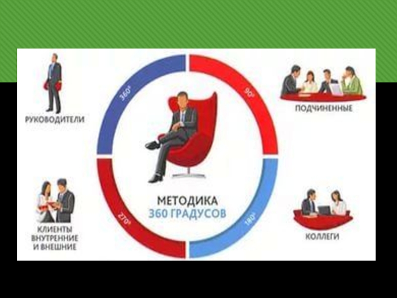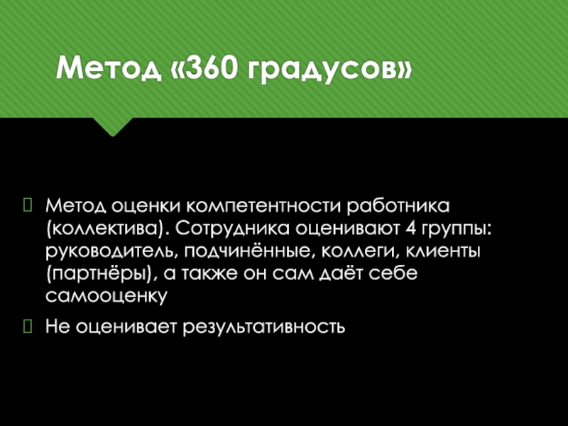 Метод «360 градусов»Метод оценки компетентности работника (коллектива). Сотрудника оценивают 4 группы: руководитель, подчинённые, коллеги, клиенты (партнёры), а