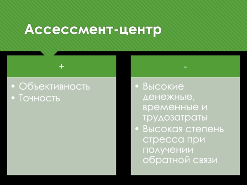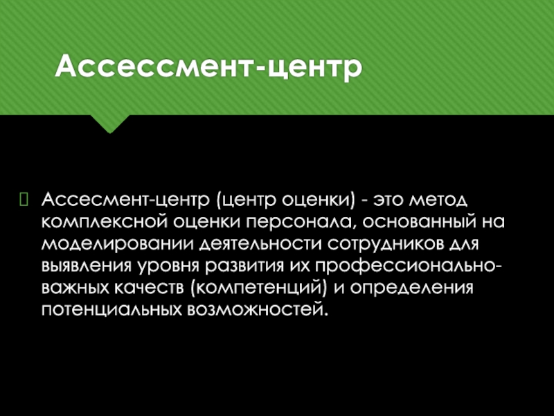 Ассессмент-центрАссесмент-центр (центр оценки) - это метод комплексной оценки персонала, основанный на моделировании деятельности сотрудников для выявления уровня