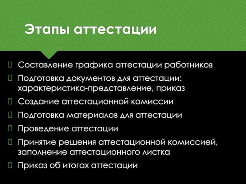 Этапы аттестацииСоставление графика аттестации работниковПодготовка документов для аттестации: характеристика-представление, приказСоздание аттестационной комиссии Подготовка материалов для аттестации Проведение