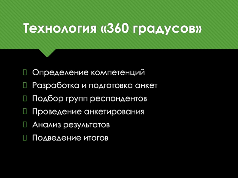 Технология «360 градусов» Определение компетенцийРазработка и подготовка анкетПодбор групп респондентовПроведение анкетированияАнализ результатовПодведение итогов