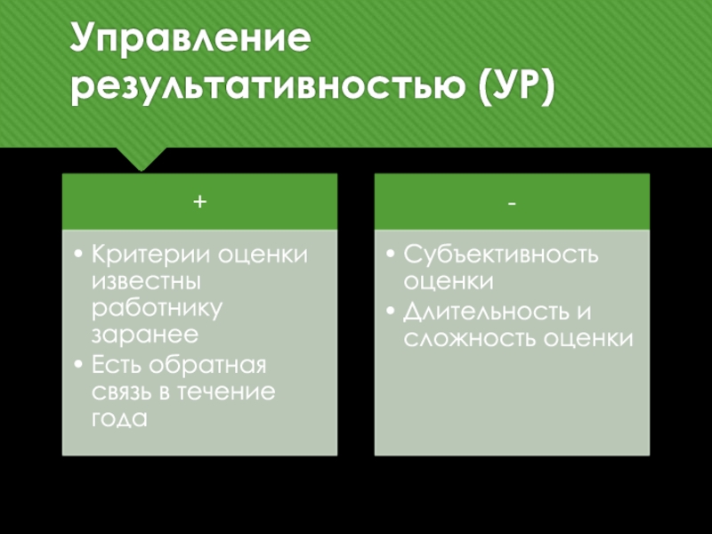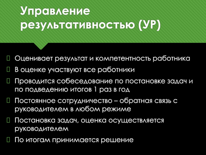 Управление результативностью (УР)Оценивает результат и компетентность работникаВ оценке участвуют все работникиПроводится собеседование по постановке задач и по