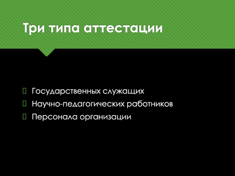 Три типа аттестацииГосударственных служащихНаучно-педагогических работниковПерсонала организации
