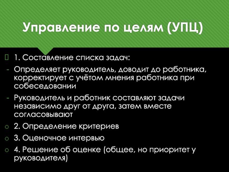 Управление по целям (УПЦ)1. Составление списка задач:Определяет руководитель, доводит до работника, корректирует с учётом мнения работника при