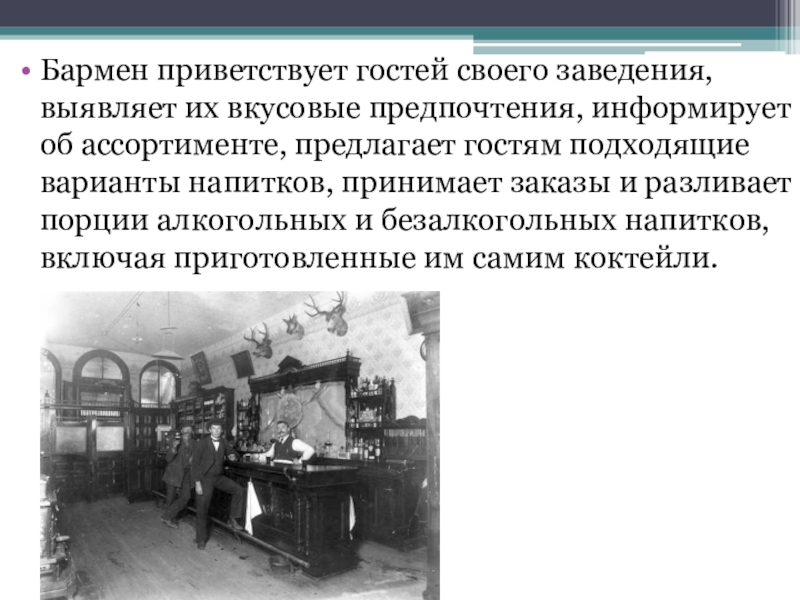Слайд 9Бармен приветствует гостей своего заведения, выявляет их вкусовые предпочтения, информирует об