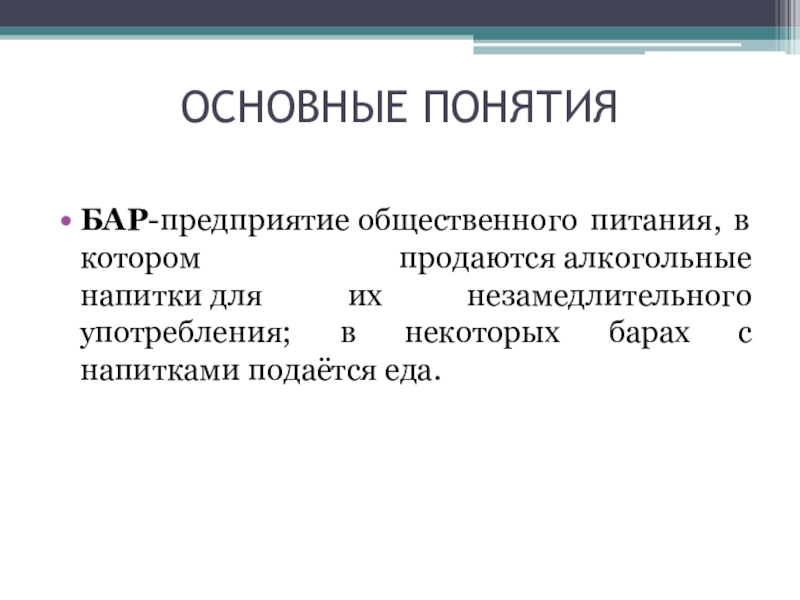 БАР-предприятие общественного питания, в котором продаются алкогольные напитки для их незамедлительного употребления; в