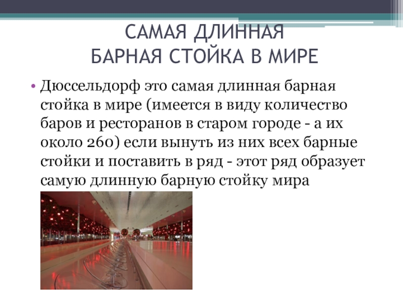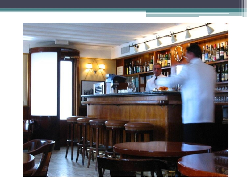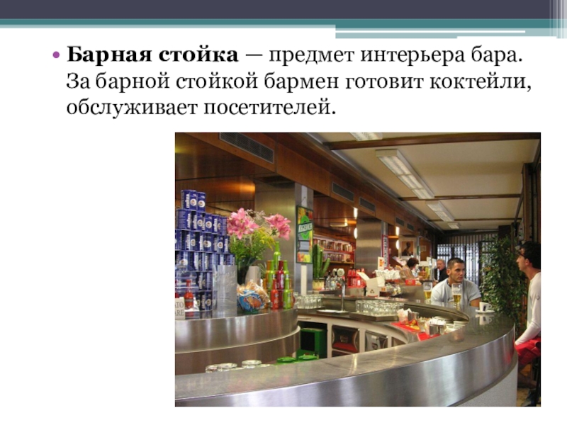Слайд 10Барная стойка — предмет интерьера бара. За барной стойкой бармен готовит коктейли, обслуживает
