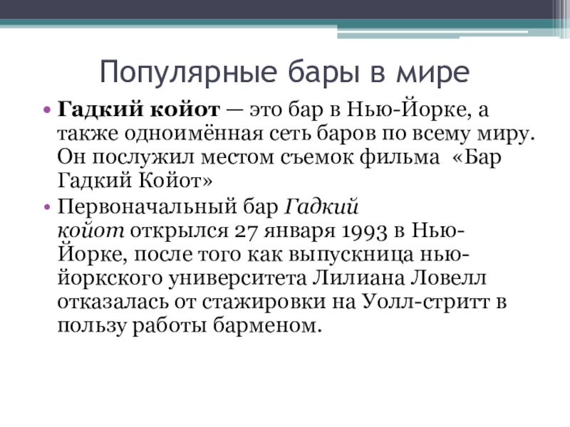 Первоначальный бар Гадкий койот открылся 27 января 1993 в Нью-Йорке, после того как выпускница нью-йоркского университета Лилиана Ловелл отказалась от стажировки на Уолл-стритт в пользу работы барменом.