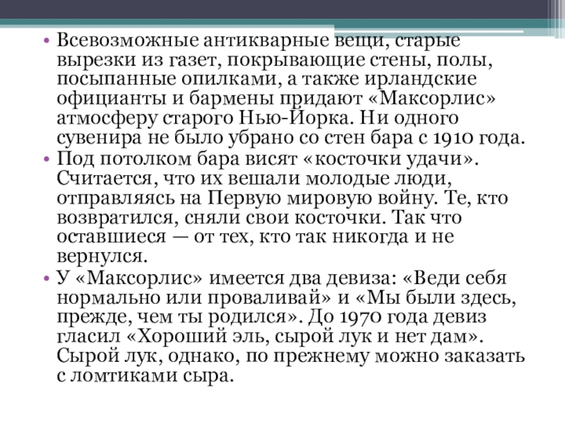опилками, а также ирландские официанты и бармены придают «Максорлис» атмосферу старого Нью-Йорка. Ни одного сувенира не было убрано со стен бара с 1910 года.
