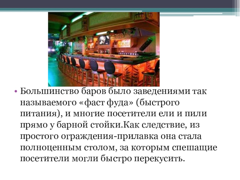 Слайд 12Большинство баров было заведениями так называемого «фаст фуда» (быстрого питания), и