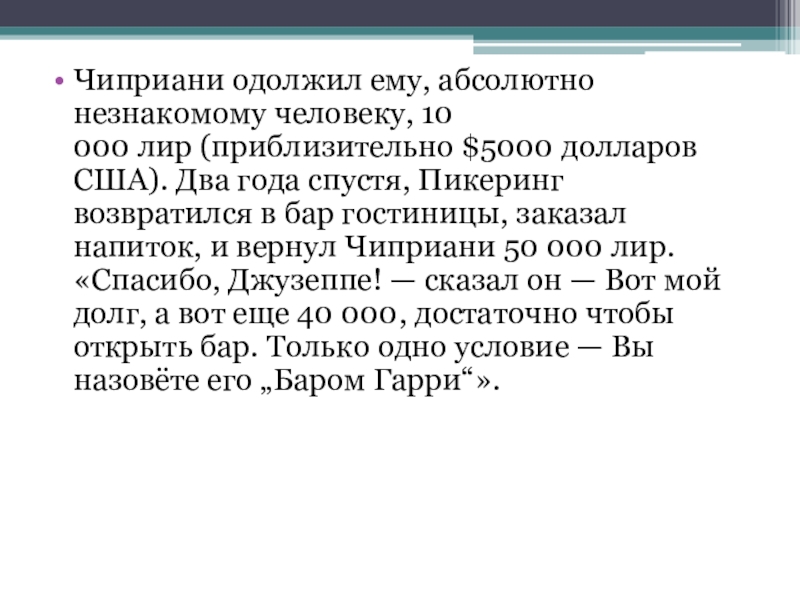 Слайд 20Чиприани одолжил ему, абсолютно незнакомому человеку, 10 000 лир (приблизительно $5000 долларов США). Два