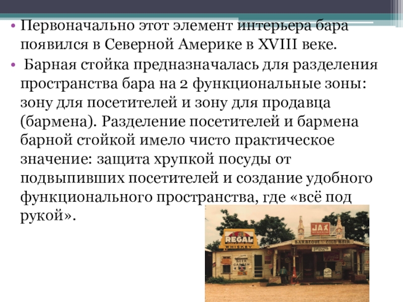 Слайд 11Первоначально этот элемент интерьера бара появился в Северной Америке в XVIII