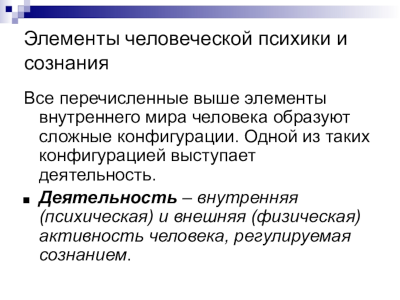 Деятельность – внутренняя (психическая) и внешняя (физическая) активность человека, регулируемая сознанием.