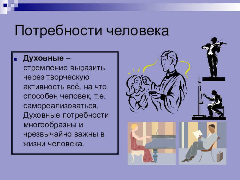 способен человек, т.е. самореализоваться. Духовные потребности многообразны и чрезвычайно важны в жизни человека.
