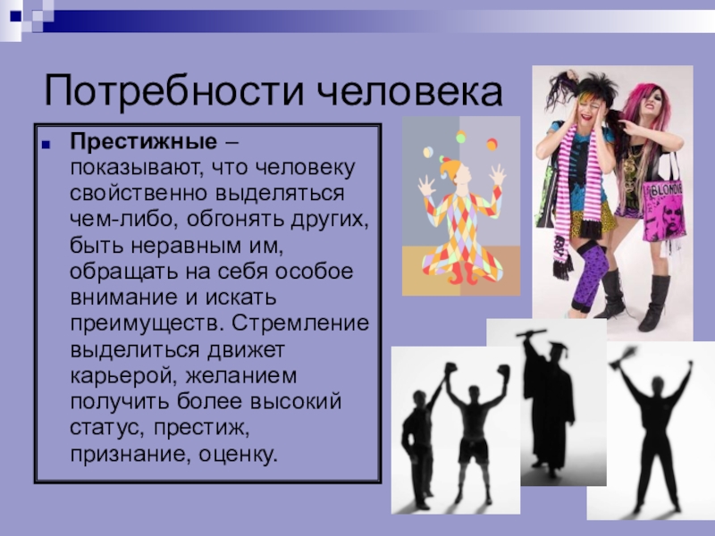 Престижные – показывают, что человеку свойственно выделяться чем-либо, обгонять других,